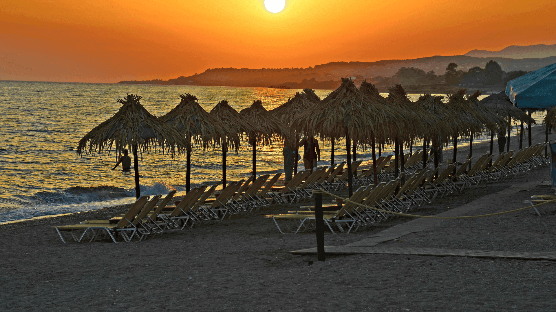 Byens strand ligger lige over for fyrtårnet, og der er restauranter, hoteller og caféer i nærheden. Længere ude er der en organiseret strand med solsenge, parasoller og meget lavt vand til børn. Hele kysten mod vest er én sammenhængende strand, der er delt op i mindre strande som Agiou Markou, Agia Paraskevis, Mesimbrias, Dikela, Skorpia og Petropon. De fleste har taverner og caféer, men ikke alle tilbyder andre faciliteter, så vær forberedt for en sikkerheds skyld.