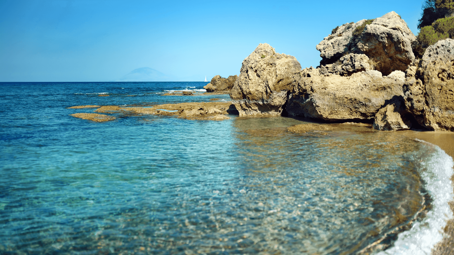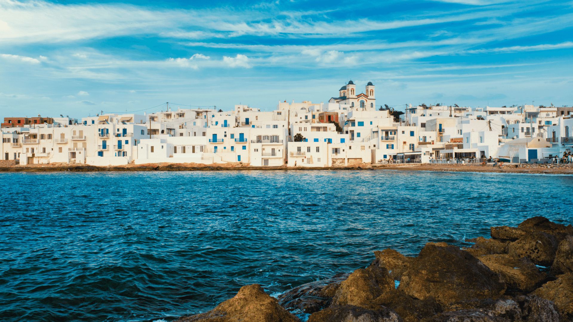 Gleich beim Hafen befindet sich der Hausstrand Kyllinis. Trotz der Nähe zu dem regen Schiffsverkehr bleibt das Wasser sauber, erfrischend und es ist gut zum Schwimmen geeignet. Es gibt Sonnenschirme, Liegen und Erfrischungen am Ufer, sodass du den entspannten Tag am Wasser genießen kannst.