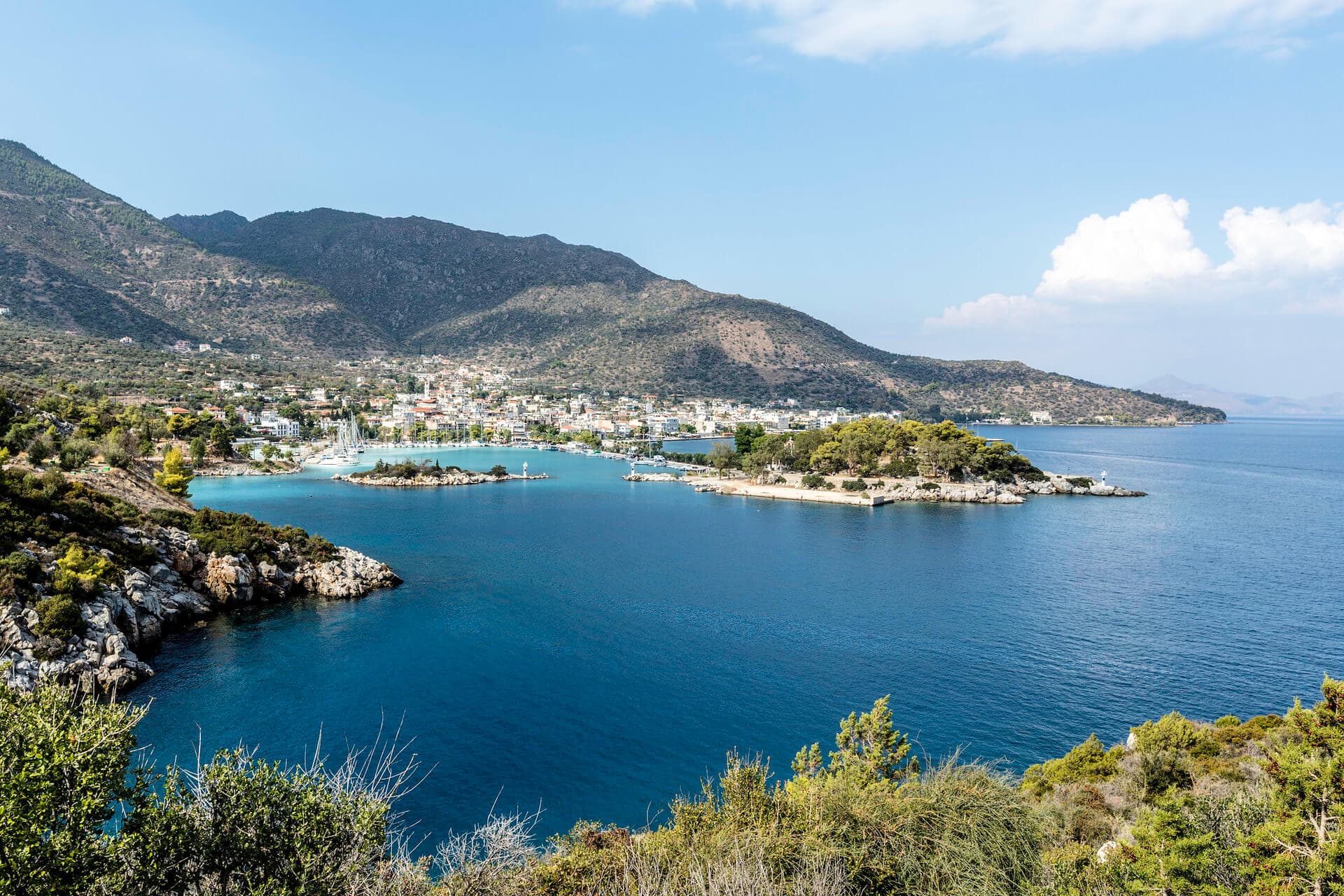 Die Hügel sind mit dunkelgrünen Bäumen bedeckt, die über das tiefblaue Wasser des Saronischen Golfs und den dazugehörigen Inseln blicken. Die Stadt Methana selbst ist reizend und klein und wie ein Amphitheater am Hang gebaut mit einem ruhigen, sauberen Hafen. Es ist der ideale Ort für einen Wochenendausflug oder einen Erholungsurlaub, wo du das reiche Angebot sowohl an natürlichen als auch an organisierten Spas nutzen kannst. Verbringe die Abende bei klassischem, griechischem Essen und Getränken im Hafenviertel und entspanne dich dank der ruhigen Atmosphäre dieses versteckten Juwels.
