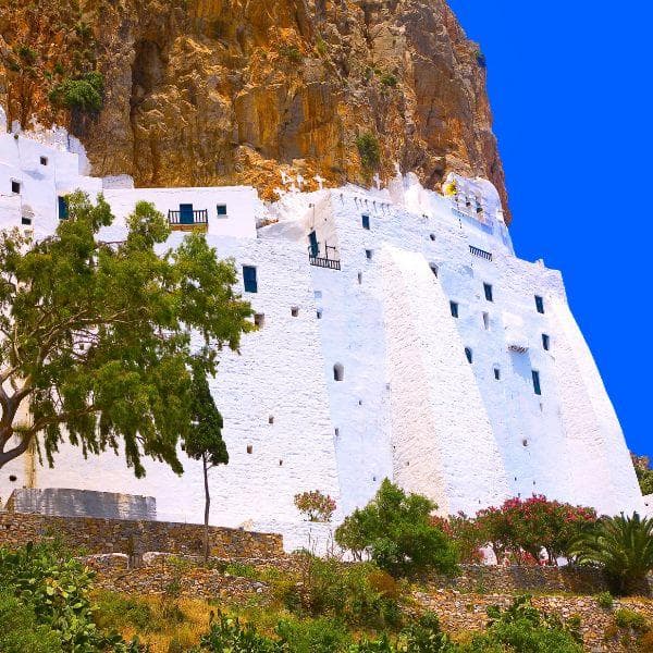 Το απόκρημνο και πανέμορφο μοναστήρι της Χοζοβιώτισσας στην Αμοργό είναι χτισμένο σε υψόμετρο 300 μέτρων. Μοιάζει σαν να κρέμεται κυριολεκτικά από τα βράχια. Η σημερινή μορφή που βλέπουμε είναι ανακαίνιση του αυτοκράτορα Αλέξιου Κομνηνού. Η εικόνα βρισκόταν στο μοναστήρι της Χοζιβά στην Παλαιστίνη. Εξ αιτίας λεηλασιών οι μοναχοί φυγαδεύθηκαν με την εικόνα και έφτασαν στην Αμοργό και η Παναγία τους υπέδειξε που θα χτιστεί ο ναός. Η μονή έχει 8 επίπεδα που επικοινωνούν μεταξύ τους με σκάλες λαξευμένες στο βράχο. Απέχει 2 χιλιόμετρα από τη χώρα και 300 σκαλιά για να ανέβεις αλλά η θέα θα σε αποζημιώσει γιατί είναι απλά συγκλονιστική. Οι μοναχοί σας καλωσορίζουν με λουκουμάκι και ψημένη ρακή Αμοργού. Τέλος, Το γενικότερο vibe στο σημείο είναι ιδιαίτερο.