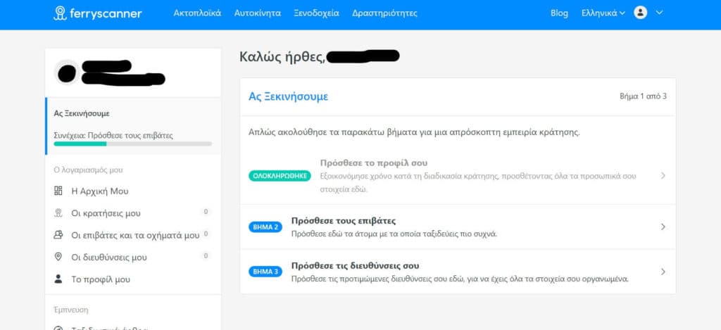 Η Ferryscanner.com ξεκίνησε να έχει μια καινούρια λειτουργία! Τώρα οι χρήστες της ιστοσελίδας μας μπορούν να δημιουργήσουν τους δικούς τους προσωποποιημένους λογαριασμούς χρήστη για να αποθηκεύσουν όλες τις πληροφορίες που χρειάζονται για την εύκολη κράτηση ακτοπλοϊκών εισιτηρίων. Πρόσθεσε τις διευθύνσεις σου, τα οχήματά σου, τους αγαπημένους σου συνταξιδιώτες και πολλά παραπάνω. Μέσω του λογαριασμού χρήστη, θα μπορείς επίσης να έχεις πρόσβαση και να διαχειρίζεσαι όλα τα ταξίδια σου με το πλοίο (τα παλιά και τα επερχόμενα).