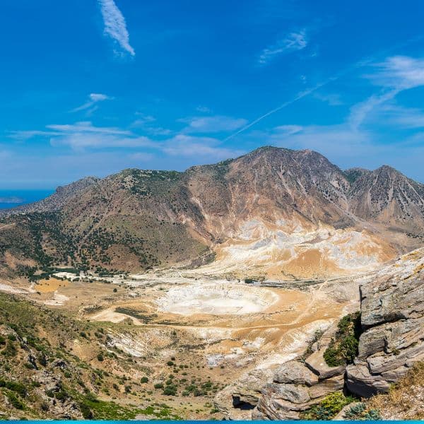 Καλοκαίρι στη Νίσυρο! Η Νίσυρος η μικρή αυτή κουκκίδα στα Δωδεκάνησα θα σε ξαφνιάσει με την άγρια ομορφιά της και τα ηφαιστειογενή της πετρώματα. Πρόκειται για το νεότερο ηφαίστειο της Ελλάδας και μπορείς να το επισκεφθείς. Φθάνοντας στο Μανδράκι που είναι το λιμάνι και η πρωτεύουσα του νησιού σίγουρα θα εντυπωσιαστείς από την όμορφη αρχιτεκτονική των σπιτιών και θα μυρίσεις το θειάφι του ηφαιστείου. Η Νίσυρος λατρεύεται όλο και περισσότερο κάθε χρόνο από τους λάτρεις του εναλλακτικού τουρισμού. Από ψηλά μοιάζει με κώνο που υψώνεται εφτακόσια μέτρα πάνω από τη θάλασσα.