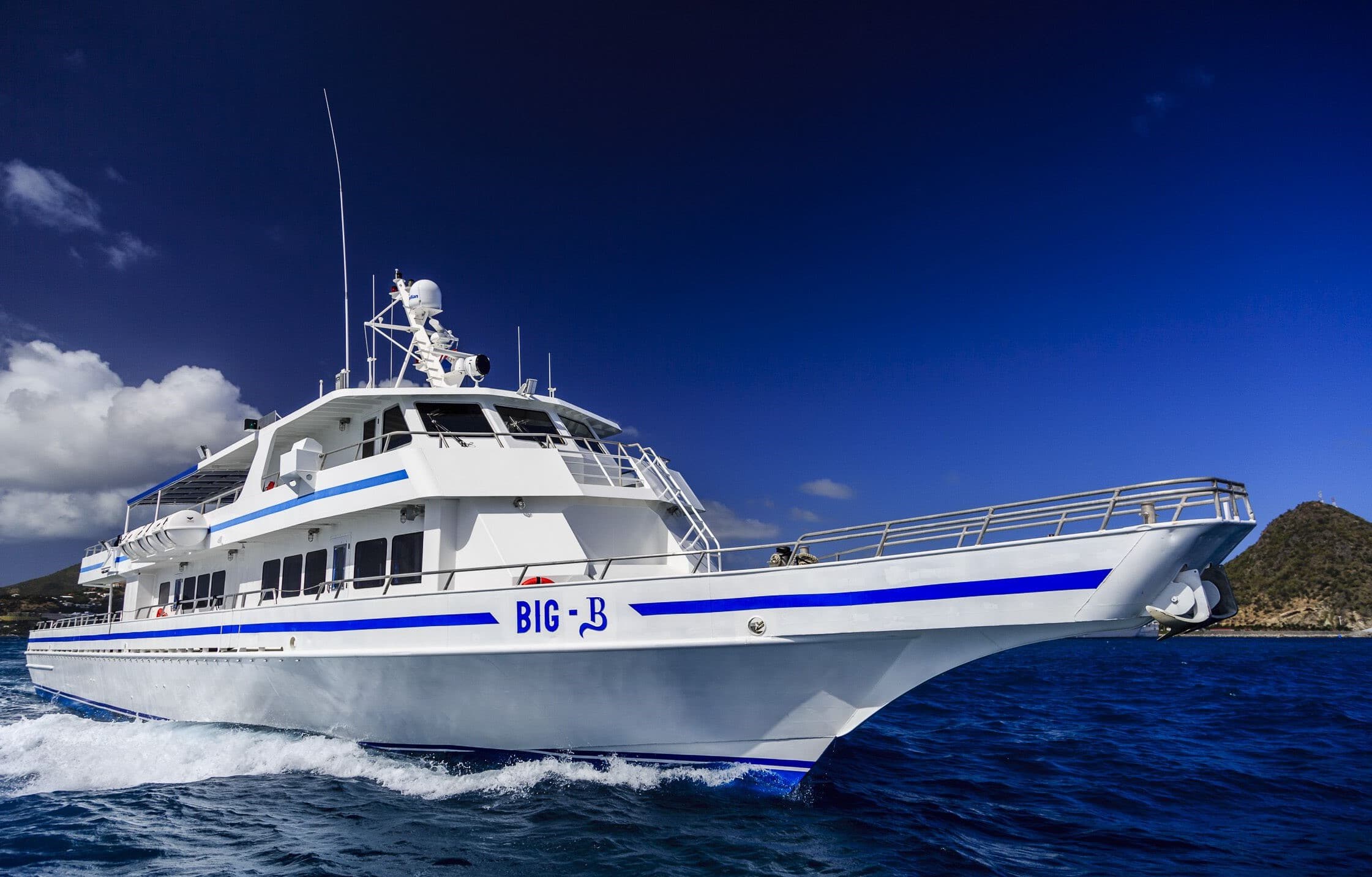 The fastest ferry from Gustavia, Saint Barthelemy in France to Philipsburg, Sint Maarten in Netherlands is , operated by Great Bay Express, with a crossing time of 45min.