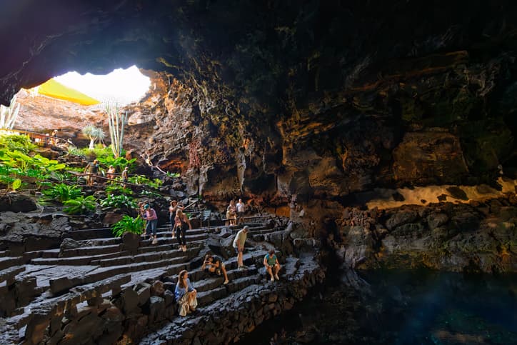 Turistas visitando los Jameos del Agua en Lanzarote, una pieza de arquitectura única, donde puedes tener una cena especial por estas fiestas. Fuente: iStock