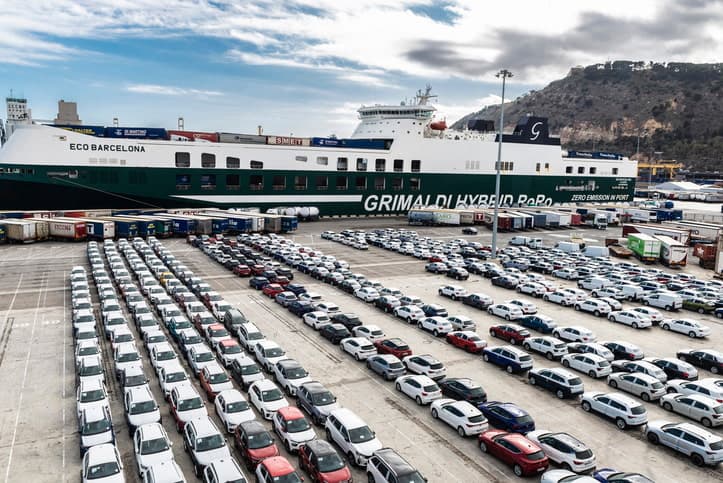Un carguero híbrido de Grimaldi Lines atracado en la rampa de carga de Barcelona.