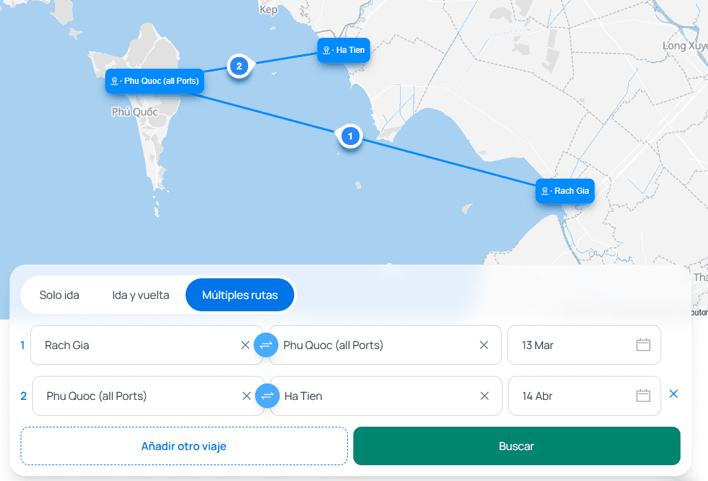 El motor de búsqueda Ferryscanner es la forma más sencilla de encontrar y reservar billetes de ferry para explorar Vietnam en sólo unos segundos. Las rutas más concurridas deben reservarse con antelación, igual que harías con un vuelo. Travesías como Rach Gia – Phu Quoc y Tran De – Con Dao se llenan rápidamente durante la temporada alta y las vacaciones.