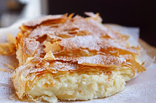 Si vistitas Creta no te puedes perder de una delicia adoptada de Oriente Medio, la bougatsa, un pastel de pasta filo relleno de crema pastelera, queso o carne picada. Otros ricos postres son las kaltsounias, pequeñas tartas dulces y las _Kserotigana_s, pasteles en forma de rosa o espiral. Si vas a Sfakia, al sur de la isla, no dejes de probar sus panqueques con harina, miel, queso y raki.