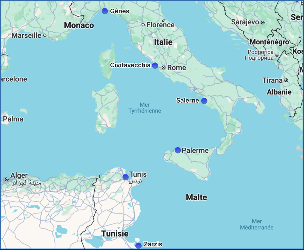 Les traversées en bateau Italie-Tunisie s’opèrent depuis de nombreux ports donnant sur la mer Tyrrhénienne. Source : Ferryscanner.com.