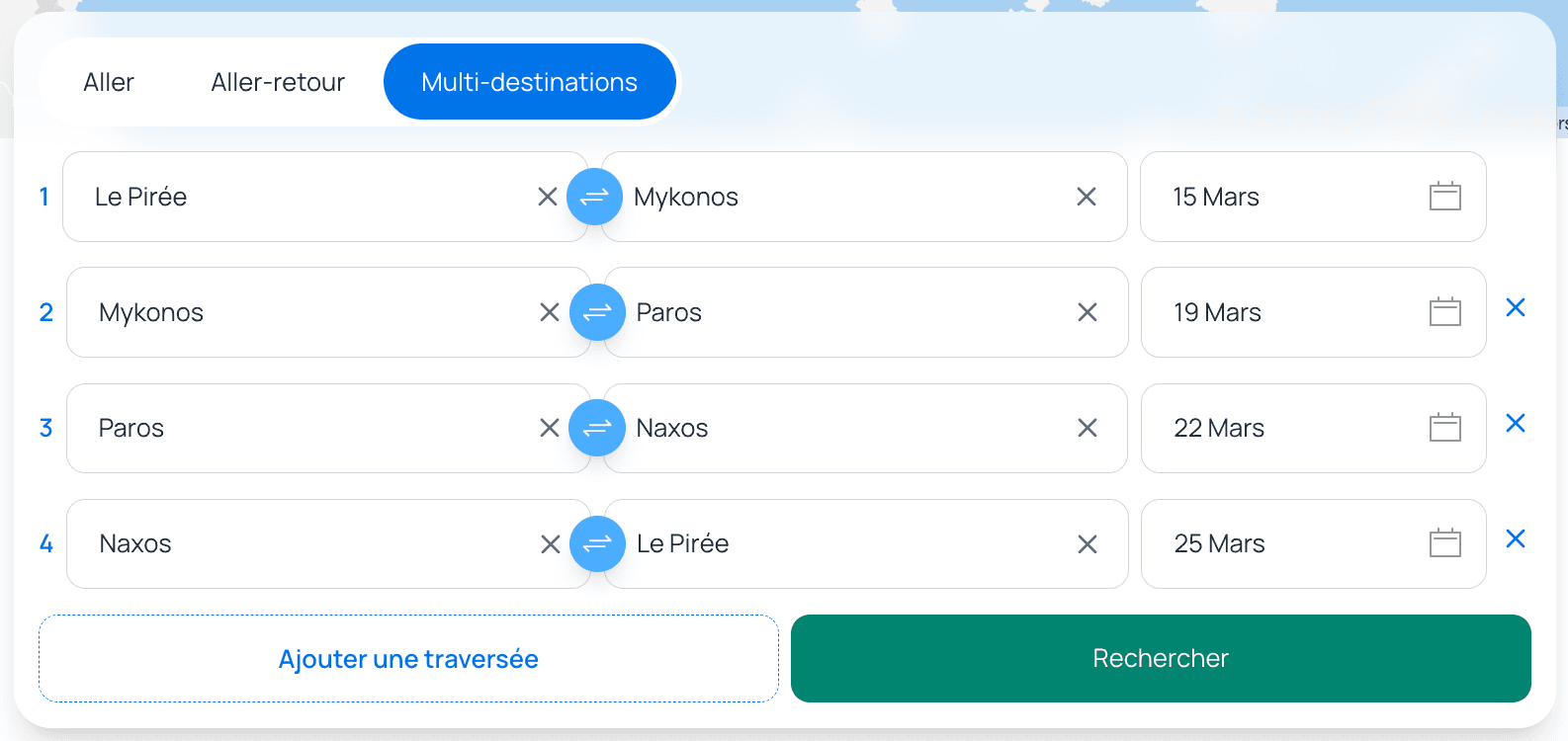 Imaginons que, pour votre prochain voyage, vous souhaitiez explorer les îles grecques au départ d’Athènes. Aucun problème ! La fonction Multi-Destination permet d’ajouter des étapes, et par défaut, la destination de l’étape précédente devient l’origine de la nouvelle étape.