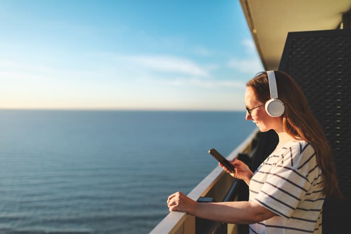 T-shirt comoda, cuffie e mare all’orizzonte: ecco come vivere al meglio una tratta breve in traghetto, tra relax e panorama. Fonte: iStock