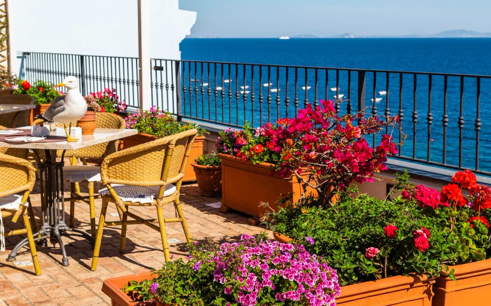 Una terrazza fiorita con vista sul mare cristallino di Capri