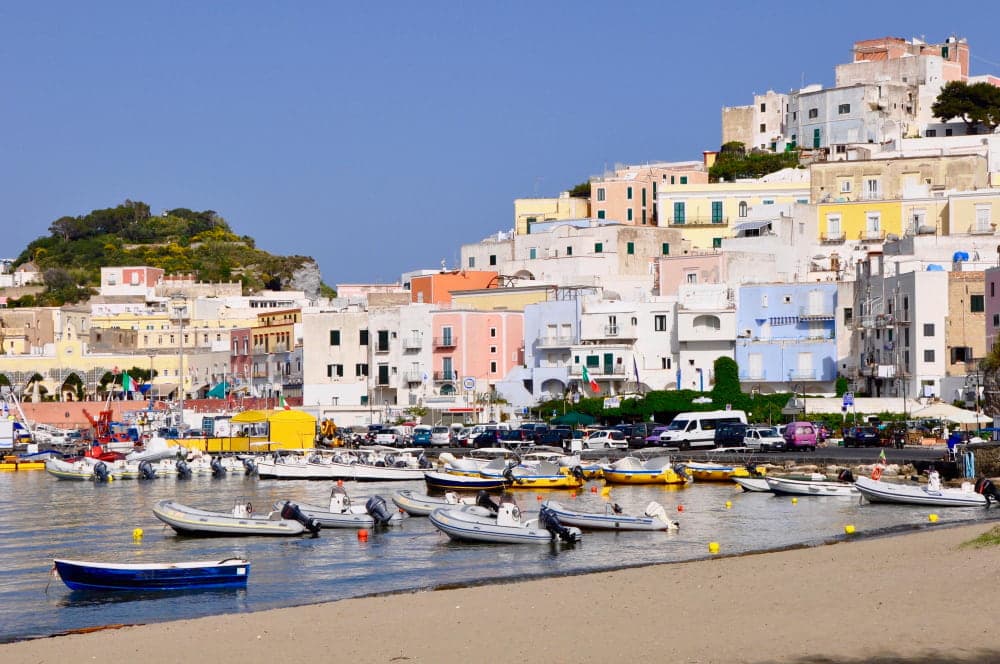 Il pittoresco villaggio di Ponza con le sue case pastello affacciate sul mare. Fonte: Freepik