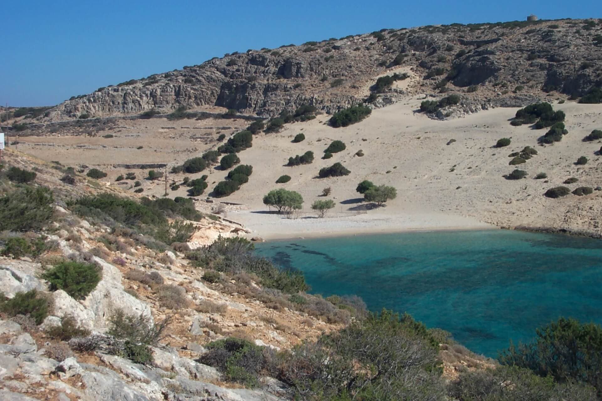 Ky plazh është rreth 1.5 km nga Chora dhe është me rërë me ujëra transparente dhe disa pemë për hije. Ashtu si me shumicën e plazheve në Schinoussa, ai është i paorganizuar dhe për këtë arsye ofron një vend relaksues për t’u çlodhur në një mjedis të qetë. Ju mund ta arrini atë duke bërë një shëtitje 15-minutëshe përgjatë një rruge të dheut nga qyteti kryesor.